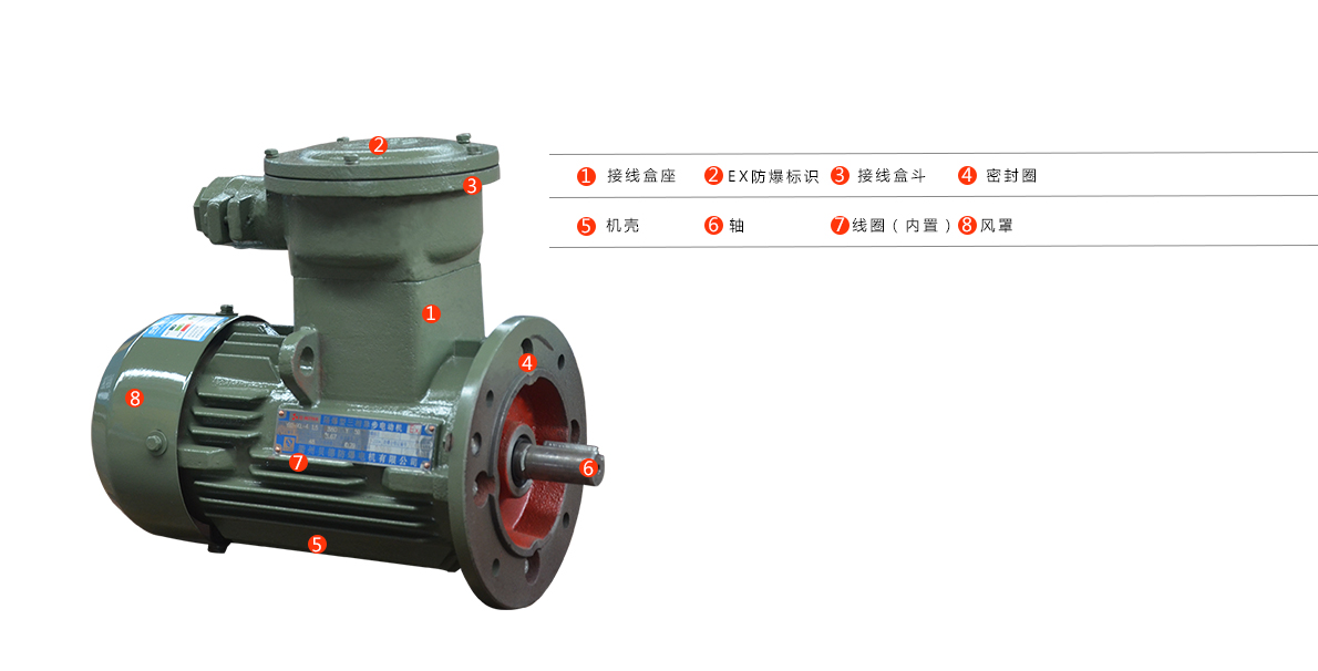 采用垂直水平的平行散熱片結(jié)構(gòu),接線盒在機座頂部,接線盒的進線方式為橡套電纜,其接線端子分為三個(供一種電壓)或六個(供兩種電壓)兩種結(jié)構(gòu)。